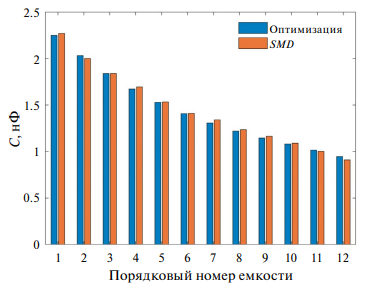 Сравнение найденного при решении задачи минимизации распределения емкости и подобранного с использованием высоковольтных SMD-конденсаторов приведено на рис. 9. Из приведенной диаграммы следует, что определенный ряд SMD-конденсаторов в корпусе 1206 позволяет достичь требуемых емкостей с достаточно высокой точностью.