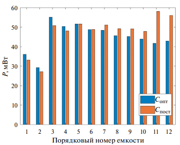 На рис. 10 приведено распределение потерь в диодах в зависимости от их порядковых номеров (рис. 1). Из распределения следует, что оптимизация емкости позволяет снизить термическую нагрузку диодов. Для случая постоянной емкости суммарные потери энергии равны 0.57 Вт, в то время как при оптимизационном распределении они на 5% ниже и равны 0.54 Вт.