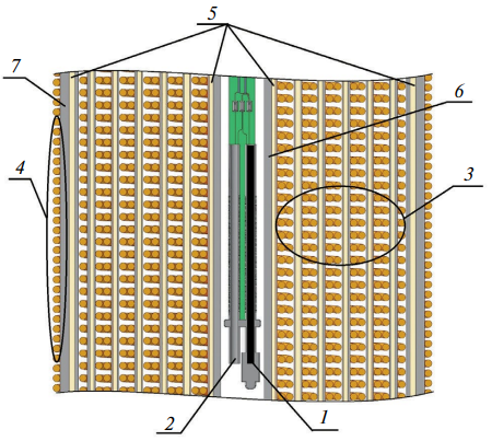 Рис. 1. Схематический разрез центральной части соленоида: 1 – трубка с магнитной жидкостью и измерительной катушкой; 2 – трубка с компенсационной катушкой; 3 – обмотка для создания постоянного поля; 4 – обмотка для зондирующего переменного поля; 5 – трансформаторное масло; 6 – внутренний цилиндр; 7 – внешний цилиндр.