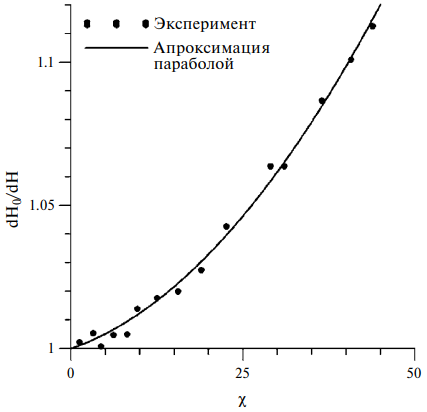 Полученные результаты представлены на рис. 3. Из него видно, что убывание компенсационного сигнала с ростом восприимчивости магнитной жидкости хорошо аппроксимируется параболической зависимостью. В этом случае размагничивающий фактор является линейной функцией восприимчивости образца: