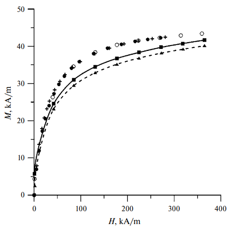 Приведенные на рис. 4 результаты измерений намагниченности твердого образца обоими методами хорошо совпадают как между собой, так и с результатами, полученными для жидкого образца методом дифференциальной прогонки. Все экспериментальные точки практически ложатся на одну кривую. Кривая намагничивания жидкого образца, полученная на вибрационном магнитометре (сплошная линия), лежит существенно ниже кривой, измеренной методом дифференциальной прогонки. Наблюдаемое расхождение значительно больше ожидаемой погрешности измерений. При замене несущей жидкости на менее вязкую (керосин) расхождение между кривыми намагничивания возрастает. На рисунке этому соответствует штриховая линия.