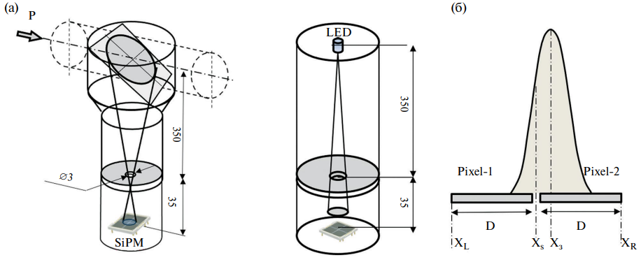 Схема стенда для измерения координаты положения светового пучка, имитирующего световой образ протонного пучка в радиаторе двухкоординатного монитора, показана на рис. 1б. Световой пучок образуется с помощью светодиода (LED) и коллиматора диаметром 3 мм, установленного на расстоянии 350 мм от LED. При этом фотодетектор SiPM может передвигаться относительно коллиматора в одном направлении (X) на расстояние 10 мм. Для координатных измерений фотоэлементы объединялись в две группы по два элемента. Тем самым фотодетектор имеет два фотоэлемента (Pixel1, Pixel2) размером 3 мм по оси X и 6 мм по другой оси. На рис. 1б по горизонтальной оси X показано положение центра светового пучка (Xp), размер пикселя (D = 3 мм) и координаты левого (XL) края Pixel1, центра положения между фотоэлементами (Xs) и правого (XR) края Pixel2.