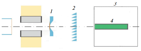 Рис. 1. Схема экспериментальной протонной лучевой установки ИЯИ РАН: 1 – фигурный рассеиватель, 2 – гребенчатый фильтр, 3 – водный фантом, 4 – радиохромная пленка EBT-XD.
