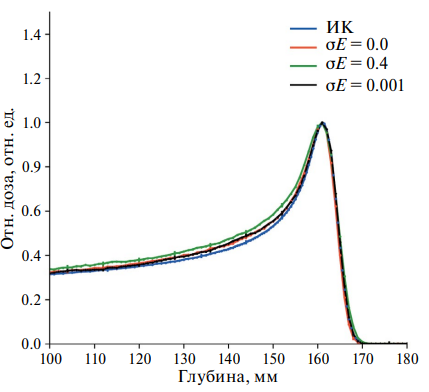 Расчеты и измерения проводились для фиксированного горизонтального пучка протонов с энергией E = 160 МэВ и током I = 18 мкА, что соответствует конвенциональному режиму облучения. Для симуляций в программном пакете TOPAS MC [8] в качестве начальных поперечных размеров пучка до попадания в водный фантом использовались параметры гауссовых распределений σx = 11.8 см и σy = 9.8 см. Такие значения наиболее точно описывают измеренные с помощью пленок профили пучка перед фантомом. Для симуляции в TOPAS MC также требовалось определить параметр энергетического спектра пучка, описываемого величиной стандартного отклонения от среднего в распределении Гаусса. Данный параметр влияет на распределение ЛПЭ и другие исследуемые величины. Величина стандартного отклонения подбиралась путем сравнения расчетных и измеренных с помощью ионизационной камеры дозовых распределений для начального пучка без влияния системы пассивного формирования. Результаты сравнения, представленные на рис. 2, показывают наилучшее соответствие форм кривой пика Брэгга при значении стандартного отклонения равного нулю. Таким образом, можно сделать вывод об отсутствии разброса энергии пучка в эксперименте.