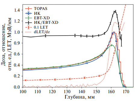 Глубинное распределение дозы, рассчитанное в пакете TOPAS MC (красная кривая), достаточно хорошо согласуется с измеренным ионизационной камерой (ИК, синяя кривая): коэффициент детерминации R2 = 0.996 и данные кривые почти совпадают после сглаживания рассчитанной кривой. Отметим, что теоретическая и экспериментальная кривые почти совпали, когда единственный свободный параметр расчета (σE) принял нулевое значение. В то же время распределение, полученное с применением пленок (зеленая кривая, EBT-XD), существенно недооценивает дозу в области ее максимальных значений, где этот недоучет доходит почти до 40%. Это иллюстрирует отношение значений доз, полученных с ионизационными камерами и пленками (черная кривая, ИК/EBT-XD). Еще одним выводом из рис. 3 является то, что указанное экспериментальное отношение значений доз (ИК/EBT-XD) и градиент ЛПЭ (dLET/dz) имеют схожее поведение и даже совпадающие по положению перегибы соответствующих кривых (черная и красная пунктирная кривые). Поскольку ионизационные камеры и расчеты методом Монте-Карло дают очень близкие результаты для дозовых распределений, можно предположить, что отклонение наблюдается у показаний пленочных детекторов и оно может быть связано с локальным градиентом ЛПЭ.