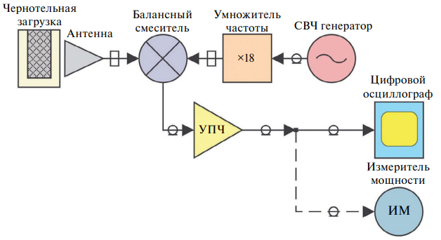 В эксперименте по определению собственной шумовой температуры супергетеродинного приемника с центральной частотой f0 = 230 ГГц и полосой приема 8 ГГц (с учетом зеркального канала) использовалась элементная база компании МВЭЙВ (Россия, Черноголовка – www.emwave.ru). Основная схема измерений выходной мощности сигнала соответствовала представленной на рис. 1. Мощность сигнала на выходе приемника измерялась несколькими способами: