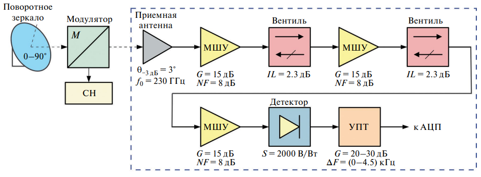 Принимая во внимание все изложенное выше, мы создали схему субТГц-радиометра для оценки прозрачности атмосферы в окне 1.3 мм, представленную на рис. 6.