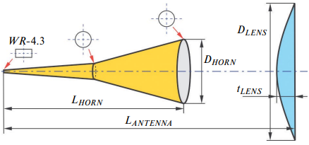 Во избежание конденсации влаги весь приемный тракт должен быть размещен в герметичном отсеке, находящемся под избыточным давлением (достаточно величины порядка 1.1 атм). В качества газа-заполнителя может выступать сильно обезвоженный воздух, азот или другой инертный газ. Разность давлений снаружи и внутри будет сигнализировать о сохранении герметичности. Эскизный чертеж субТГц-приемного тракта в герметичном отсеке представлен на рис. 10. Здесь фторопластовая линза антенной системы играет роль радиопрозрачного герметичного окна.