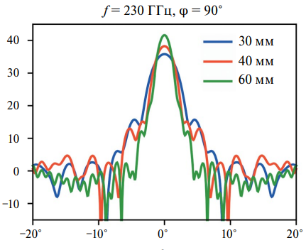 Было рассмотрено три варианта исполнения рупорно-линзовой антенной системы, эскиз которой представлен на рис. 7, с различными диаметрами линз (табл. 6). Размер питающего порта волновода взят стандартный – WR-4.3 (1.092 × 0.546 мм2), диэлектрическая проницаемость линзы задавалась формулой ε = 2.2 (Фторопласт Ф4). Диаграммы направленности в обеих плоскостях для центральной частоты f0 = 230 ГГц из рассматриваемого диапазона, рассчитанные в пакете электродинамического моделирования CST MWS, представлены на рис. 8, 9.