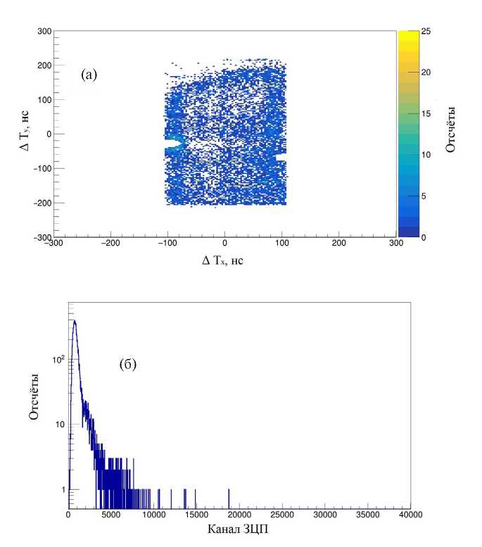 На рис. 5б и 5в представлены суммы времени прихода сигналов на оба конца линии задержки для x- и y-координат соответственно. Они содержат, помимо основного пика, соответствующего общей длительности линии задержки, побочные пики. Побочные пики возникают в сумме времени прихода сигнала из-за осциллирующей формы некоторых анодных сигналов (рис. 6а).