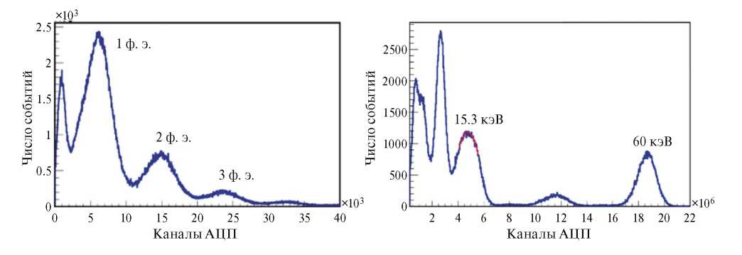 На рис. 3 слева показан спектр шумов фотодиодной матрицы с четко выраженными пиками, соответствующими дискретной структуре амплитуды шумов. Данный спектр используется для амплитудной калибровки детектора, поскольку расстояние между соседними пиками соответствует одному фотоэлектрону. На соседнем рисунке представлен амплитудный спектр сигналов с детектора, полученный при его облучении гамма-источником 241Am. Самый правый пик в спектре соответствует энерговыделению 60 кэВ, для которого количество фотоэлектронов равно 2137 ф.э. Таким образом, удельный светосбор сцинтилляционного детектора SrI₂(Eu) составляет 35.6 ф.э./кэВ.