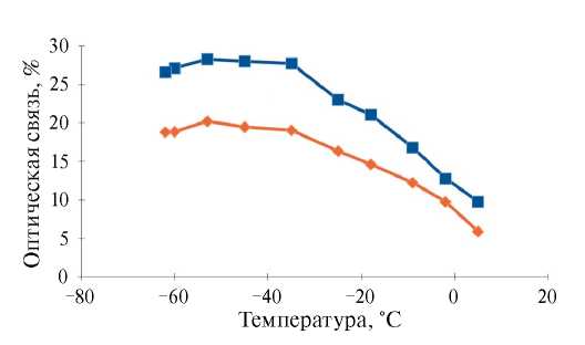 Рис. 6. Зависимость величины оптической связи между пикселями SiPM от температуры фотодетектора при для двух значений перенапряжения 3.5 В (красные точки) и 4.5 В (синие точки).