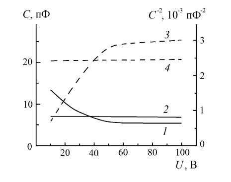 Рис. 2. Зависимости емкости С (1, 2) и параметра С⁻² (3, 4) от приложенного напряжения для Si-детекторов: 1, 3 – необлученный образец; 2, 4 – детектор, облученный потоком Ф = 5.1⋅10¹³ н/см².