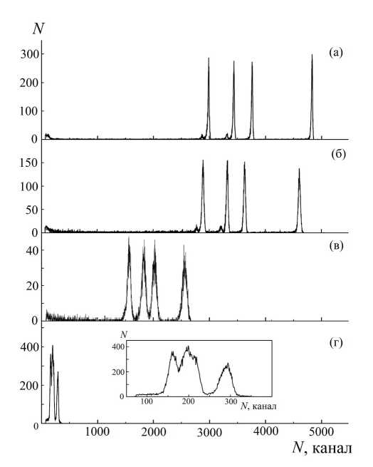 Рис. 3. Спектры ²²⁶Ra, измеренные с помощью SiC-детекторов: а — необлученный образец; б, в, г — детекторы, облученные соответственно нейтронными потоками Ф = 5.1⋅10¹³, 5.4⋅10¹⁴ и 3.4⋅10¹⁵ н/см².