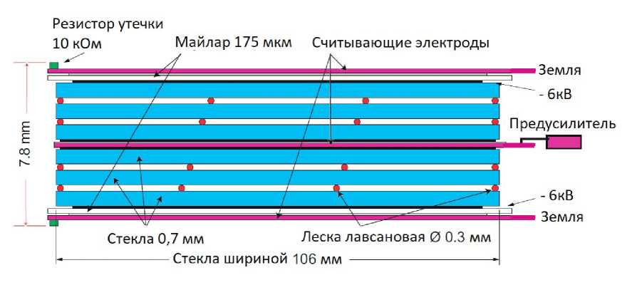 В результате проведенных исследований камер МРПС [3, 4] был сделан выбор в пользу 4-зазорной РПС со стеклом толщиной 0.7 мм и величиной газовых зазоров 300 мкм и общей толщиной пакета без металлического корпуса 7.8 мм (рис. 2).