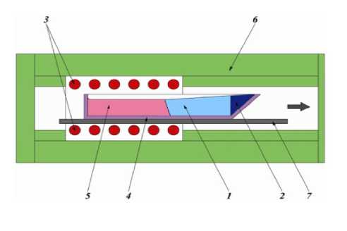 Рис. 3. Схема метода Багдасарова: 1 – кристалл, 2 – затравка, 3 – нагреватель, 4 – молибденовый контейнер, 5 – расплав, 6 – экранная теплоизоляция, 7 – волокуша.