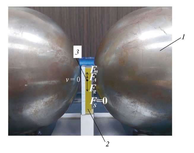 Рис. 1. Иллюстрация магнитно-реологического метода контроля магнитной восприимчивости одиночной частицы с обеспечением ее искусственного зависания: 1 — полюсные наконечники (сферической формы) электромагнитной системы магнитометра, 2 — столб жидкости, в которой осуществляется перемещение изучаемой частицы 3 с последующим зависанием (υ = 0) в точке с определенным значением магнитного силового фактора.