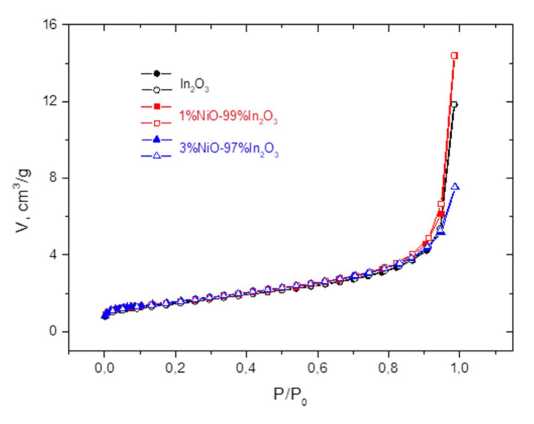 Характерные изотермы адсорбции и десорбции азота при температуре 77 K в импрегнированных нанокомпозитах NiO–In₂O₃ представлены на рис. 4. Изотермы можно отнести ко II типу по классификации IUPAC [14, 15], характерному для непористых или макропористых образцов. Они практически идентичны для всех образцов, есть лишь небольшие различия в области относительных давлений, близких к единице, где происходит заполнение макропор.