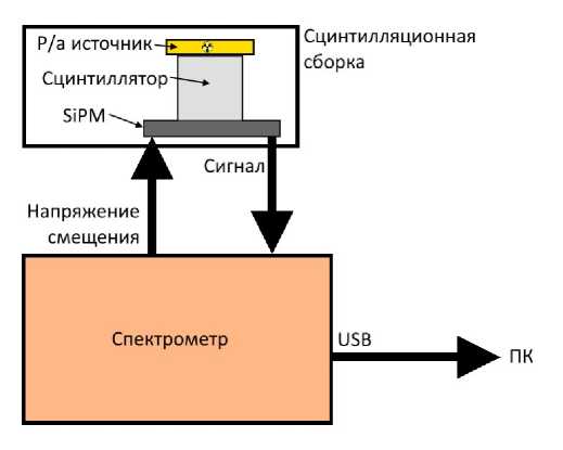 Сцинтилляционный гамма-спектрометр представляет собой сборку из сцинтиллятора, соединенного через оптический контакт с фотоприемником. В этой работе в качестве фотоприемника используется кремниевый фотоэлектронный умножитель (SiPM) серии MicroFJ-60035-TSV размером 6×6 мм2 производства компании SensL/onsemi [4]. SiPM являются полупроводниковыми аналогами традиционных ФЭУ и по многим критериям их превосходят (компактность, низкое напряжение питания, нечувствительность к магнитным полям, механическая прочность). Кремниевый фотоэлектронный умножитель представляет собой фотоприемник на основе матрицы p–n-переходов, выполненных на общей кремниевой подложке. Характерный размер одной ячейки (пикселя) составляет 10–100 мкм. При этом напряжение смещения на несколько вольт превышает напряжение пробоя p–n-перехода, что обеспечивает работу в гейгеровском режиме. При попадании кванта света в активную область ячейки в ней развивается самогасящийся гейгеровский разряд, при этом выходной сигнал является суммой сигналов с каждой ячейки SiPM, которые суммируются на общей нагрузке. Таким образом, сцинтилляционный сигнал от гамма-кванта конвертируется в электрический импульс с амплитудой сигнала, пропорциональной его энергии, для определения которой строится амплитудный спектр.