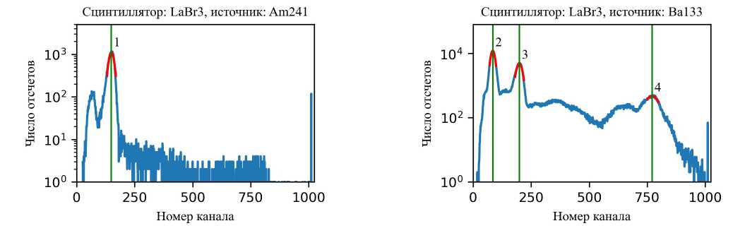 Энергетическая калибровка детекторов получается при помощи аппроксимации пиков функцией Гаусса на соответствующих спектрах. На рис. 4 приведен пример определения положения пиков для сцинтиллятора LaBr3. Для удобства восприятия оба графика приведены в полулогарифмическом масштабе.