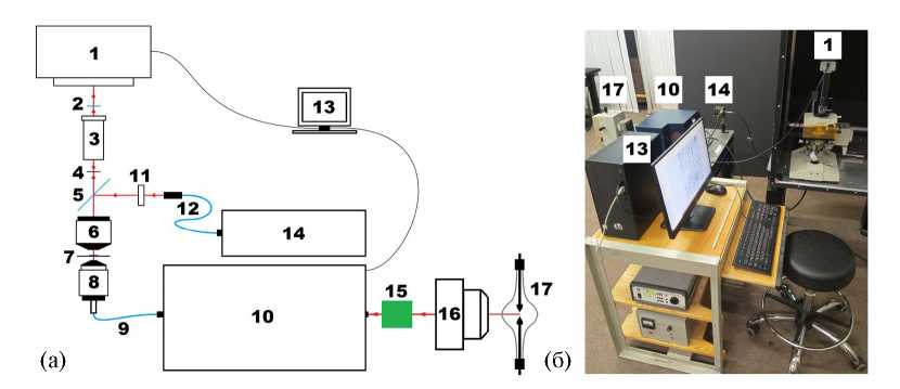 Рис. 1. Схема оптического микроскопа ЛЮМАМ-ИУФ1 с приставкой (а) и его фотография (б): 1 — УФ-камера SCM2020-UV, 2 — узкополосный интерференционный фильтр, 3 — фотоокуляр, 4 — оптический фильтр, 5 — светоделительная пластинка, 6 — объектив ОНЗ-125, 7 — исследуемый образец, 8 — объектив подсветки ОК-58, 9 — волоконно-оптический кабель, 10 — монохроматор M266, 11 — система линз, 12 — оптоволоконный кабель, 13 — управляющий ПК, 14 — полупроводниковый лазер возбуждения ФЛ наночастиц b-NaYF4:Yb3+,Tm3+ с волоконным выводом излучения (длина волны 980 нм), 15 — предварительный полосовой светофильтр, 16 — кварцевый конденсор, 17 — лампа ДКсШ-120 в фонаре. Стрелками обозначен ход световых лучей.