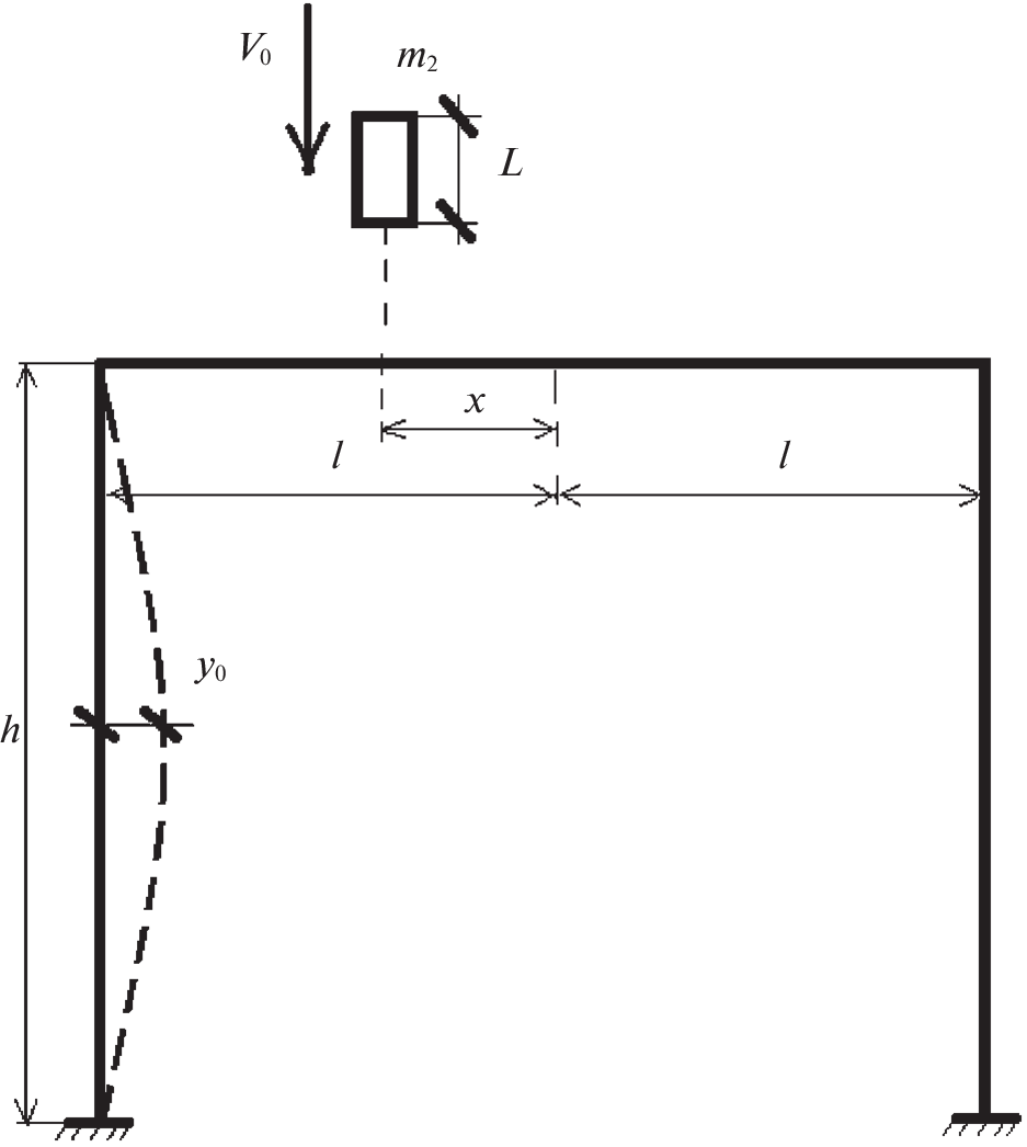 As an example, vibrations of a rigidly sealed statically indeterminate flat two-post frame experiencing a drop of a load of a given mass and pre-impact velocity are simulated. One of the vertical pillars of the frame has an initial curvature, the presence of which affects the maximum amplitude of transverse vibrations arising from impact. The impact of the load on the frame crossbar is modeled taking into account the deformation in the contact area, which is justified from the point of view of the accuracy of the calculations, because otherwise the magnitude of the impact force will be overestimated. When modeling the impact interaction of the load and the rod system under consideration, it is assumed that the falling load has the shape of a cylinder with a certain length of the generatrix. Linearization of the relationship between force and deformation of cylindrical surfaces is used.
