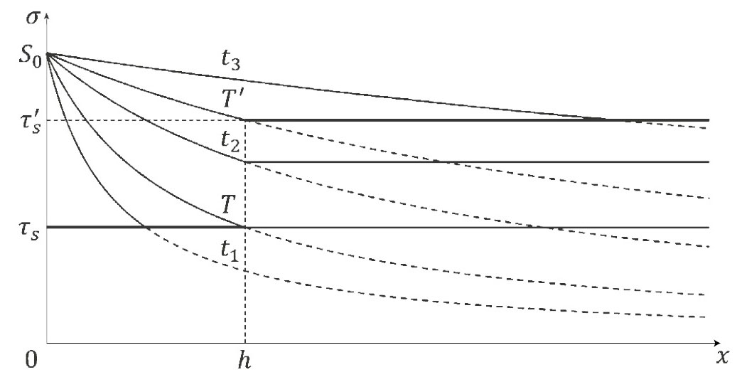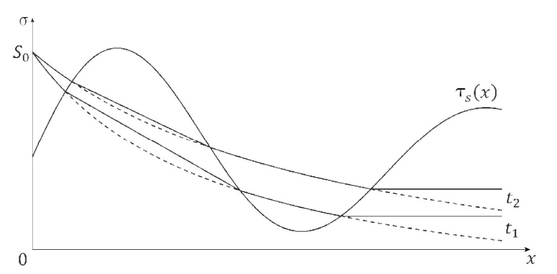 Поясним сказанное графически. На рис. 1 для двух моментов времени и () и фиксированного непрерывного по глубине распределения предела текучести приведены профили касательного напряжения и . Прямолинейные отрезки и предельные горизонтальные лучи на графиках соответствуют областям жестких зон, а криволинейные участки — областям вязкопластического сдвига, в которых решение описывается выражением (1.10).