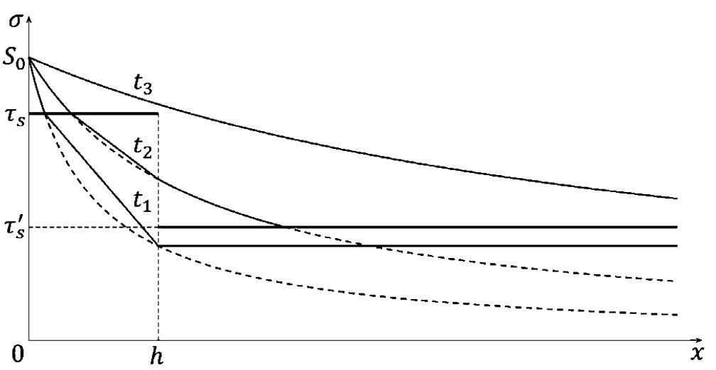 2°. На втором интервале толщина области сдвига не меняется со временем и равна . Непрерывный по профиль касательного напряжения следующий: