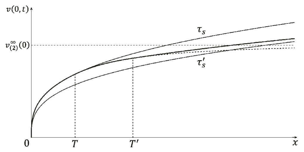 1°. На первом интервале времени решения для касательного напряжения и продольной скорости совпадают с (1.10) и (1.12). При этом скорость границы имеет вид (1.13).