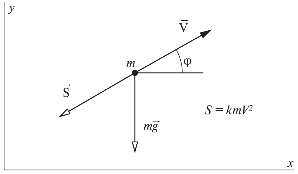 где – скорость материальной точки, φ – угол наклона вектора ее скорости к горизонтали, g – ускорение свободного падения, k – размерный коэффициент сопротивления среды, отнесенный к массе; параметры g и k считаются постоянными.