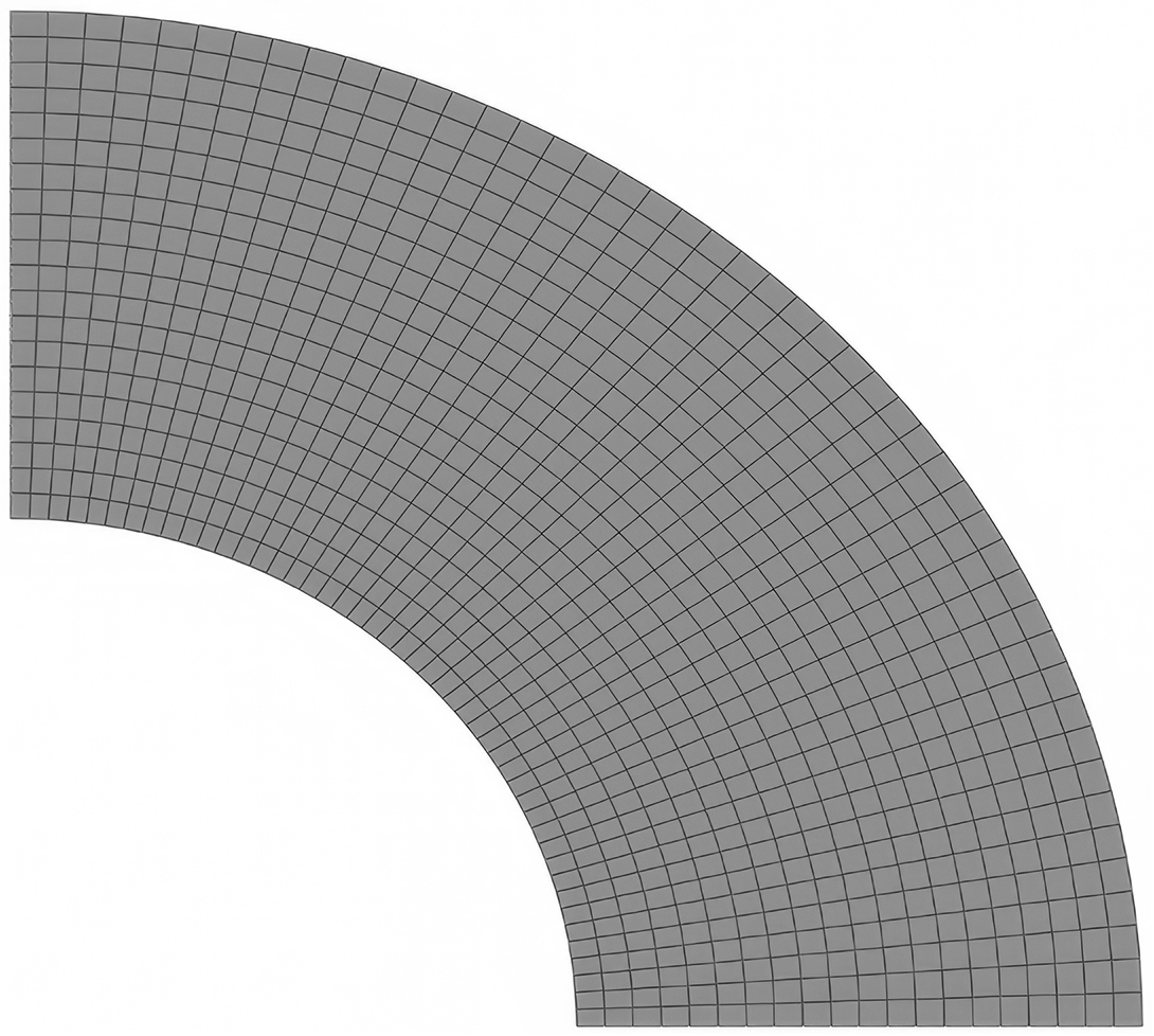 Задача решается в осесимметричной конечно-элементной постановке с конечными элементами в форме торов (двумерные осесимметричные конечные элементы типа КЭ С3X4H [37]). На рис. 2 приведена расчетная область в виде одной четвертой части сечения сферы, которая разделена на четырехугольники, каждый из которых является сечением соответствующего торообразного осесимметричного конечного элемента. На горизонтальной и вертикальной границах области выполняются условия симметрии.