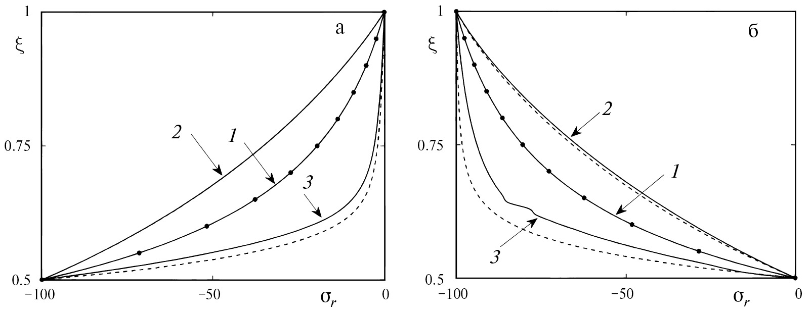 На рис. 6, а, б и 7, а, б приведены эпюры радиальных и кольцевых напряжений соответственно. Здесь – безразмерная радиальная координата. Кривые 1 соответствуют упругому решению задачи (материал оболочки находится в аустенитном фазовом состоянии), кривые 2 – этапу охлаждения в тот момент, когда фронт начала фазового перехода достиг внешней поверхности муфты, кривые 3 – этапу охлаждения, когда все сечение оболочки полностью перешло в мартенситную фазу и прямое превращение завершено, точки – аналитическому решению для упругого поведения (нанесены для проверки численного решения).