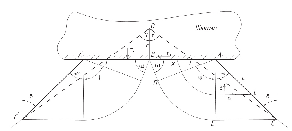 - Случай симметричного смятия. Данный случай может реализоваться при действии на штамп вертикальной нагрузки. Обозначим – угол центрированного веера поля линий скольжения, , введем угол , равный наклону участка грани клина ().