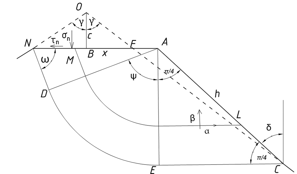 Рис. 4. Схема линий скольжения при активном сдвигающем усилии.