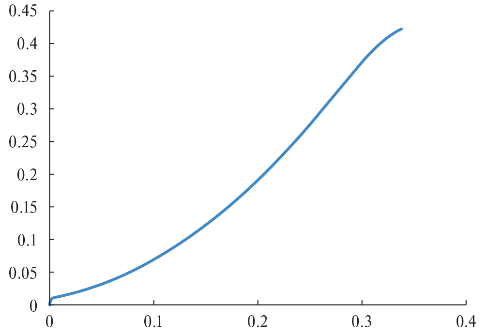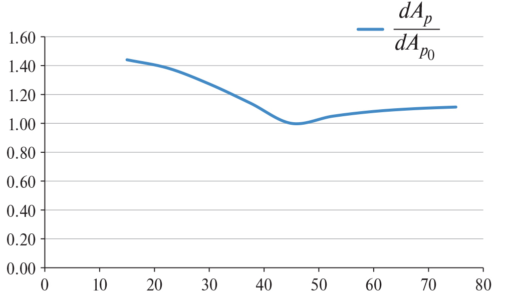 На диаграмме (рис. 7) построена зависимость (6.9) для частного случая , в интервале изменения угла . Из расчетов, проведенных также и для других значений параметров, следует, что зависимость пластической осадки штампа при сдвиге близка к линейной.