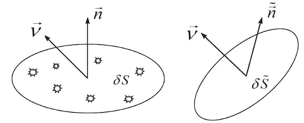 Как и выше, рассмотрим область плоскости повреждения с нормалью и опорным вектором , такую, что тензор определяет геометрическую опорную конфигурацию. Механика континуального разрушения определяет эффективную непрерывную конфигурацию с помощью модифицированной области и модифицированной нормали , как показано на рис. 2.