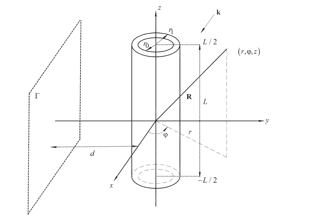 В упомянутых выше работах полагалось, что цилиндрический рассеиватель имеет бесконечную длину. Дифракция акустических волн на телах цилиндрической формы конечной длины исследовалась гораздо в меньшей степени. Приближенное решение задачи дифракции плоской гармонической акустической волны на жестком цилиндре конечной длины было предложено в [10]. В [11, 12] получена формула для акустического давления поля, рассеянного абсолютно жестким конечным цилиндром, в дальней зоне. Дифракция акустических волн на тонкостенной цилиндрической оболочке исследовалась в [13], а акустическое рассеяние сплошным тонким упругим ограниченным стержнем изучено в [14]. В [15] в качестве рассеивателя рассматривался цилиндр с полусферическими законцовками, а решение задачи было получено с использованием метода Т-матриц. Работы [16–19] посвящены решению задачи рассеяния наклонно падающей плоской акустической волны упругой тонкостенной цилиндрической оболочкой, ограниченной двумя абсолютно твердыми полусферами. В [16] получено приближенное аналитическое выражение для амплитуды рассеяния в дальней зоне поля с помощью интеграла Кирхгофа. В [17] исследованы особенности рассеяния в случае низких частот. В [18] для определения амплитуды обратного рассеяния применяется импеданс излучения ограниченной цилиндрической области. В [19] рассматривается итерационный метод решения задачи. В [20] изучено рассеяние плоской акустической волны конечным упругим сплошным цилиндром с неоднородным упругим покрытием. В каждой из перечисленных работ о дифракции звука на цилиндрическом теле конечной длины полагалось, что рассеиватель расположен в свободном безграничном пространстве.
