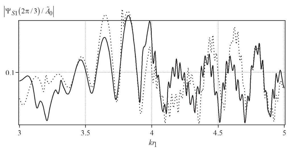 - Численные исследования. На основе полученного решения были проведены расчеты зависимости безразмерной амплитуды рассеянного поля от угловой координаты и зависимости коэффициента обратного звукового рассеяния от волнового размера тела в плоскости при . В этом случае интегралы из (3.24) принимают вид