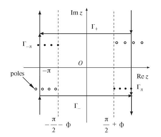 f имеет полюсы в , , , , т. е. голоморфны в проколотой окрестности точек и не имеет других особенностей на границе полосы. Постоянная будет выбрана далее.