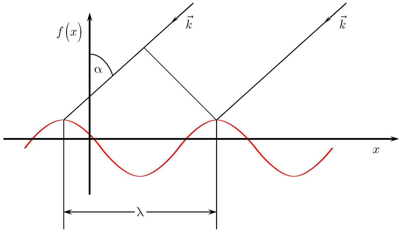 Остановимся сначала на радиолокационных измерениях. Представим себе (разумеется, упрощенно) морскую поверхность в виде синусоидальной волны. Хорошо известно, что в случае падения плоской электромагнитной волны на такую поверхность при определенном соотношении между длиной падающей электромагнитной волны (или ее волновым числом ), углом падения и периодом отражающей поверхности (см. рис. 2) часть энергии падающей волны возвращается точно назад эффект резонансного рассеяния БрэггаВульфа. Это соотношение имеет вид