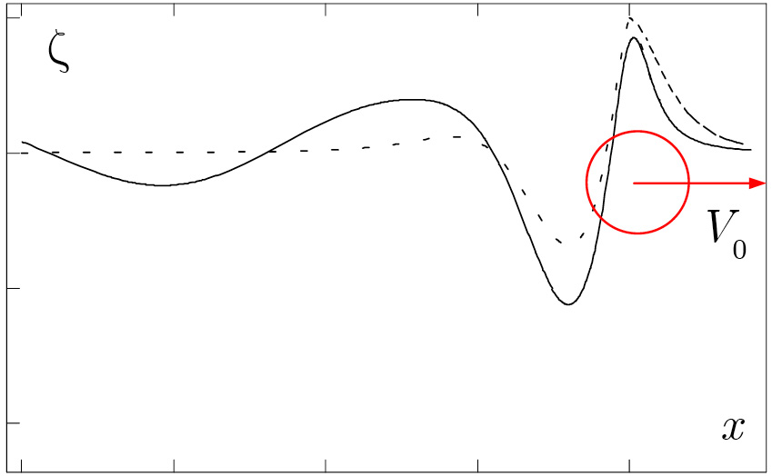 Кроме того, многочисленные экспериментальные данные говорят о том, что изменение спектра под действием течений имеют место и в длинноволновой части спектра, и для волн средней и малой длины. Ниже приводится модель, которая может претендовать на объяснение эффекта присутствия в спектре трансформаций ветрового волнения компонент различной длины, включая короткие волны (миллиметрысантиметры).