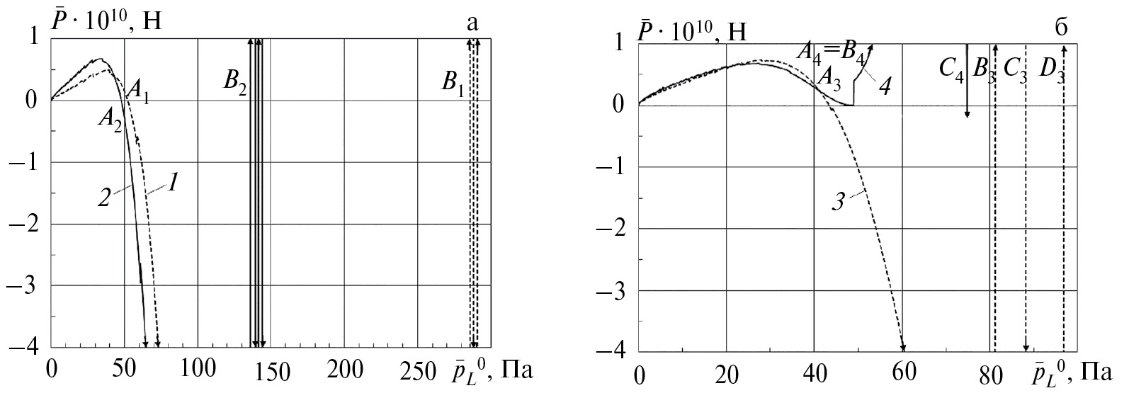 4.1. Капли малых эталонных диаметров. На рис. 6 изображены зависимости невязки в уравнении силового баланса (2.20) от величины избыточного давления в вершине водяной капли , изменяющейся в диапазоне значений (4.1). Номера кривых на рис. 6 соответствуют следующим значениям диаметров эталонных капель: кривая 1 , кривая 2 , кривая 3 и кривая 4 . Полностью наглядно изобразить зависимости не представляется возможным, так как ординаты некоторых точек на представленных кривых имеют значения на 4…6 порядков большие, чем ординаты точек на фрагментах этих кривых, изображенных на рис. 6. Стрелки указывают на поведение зависимостей на соответствующих их возрастающих или убывающих ветвях.