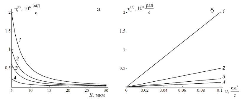 б: коэффициента кинематической вязкости ν, кривые 1–4 соответствует значениям R = 5, 10, 15, 20 мкм