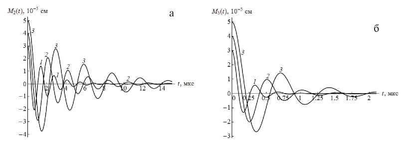 На рис. 3, а иллюстрируются численно рассчитанные по соотношению (5.16) зависимости от времени t амплитуды M2 (t) второй моды n = 2 капиллярных осцилляций мелкой облачной капли при различных радиусах. На приведенных графиках можно наблюдать, что внутриоблачная капля наименьшего размера R = 3 мкм, осциллирующая на частоте = 4.61 · 106 рад/с с декрементом затухания = 0.56 · 106 рад/с и периодом затухающих осцилляций T = 1.37 мкс, возвращается к равновесной форме, совершив ≈ 8 колебаний. Для капли большего радиуса R = 4 мкм с характеристиками осцилляций = 3 · 106 рад/с, = 0.31 · 106 рад/с, T = 2.1 мкс число колебаний до полного их исчезновения увеличивается до ≈ 10. Капля размером R = 5 мкм при = 2.15 · 106, = 0.2 · 106 рад/с, T = 2.93 мкс совершает уже ≈ 11 колебаний за время вязкого затухания, при котором искажение равновесной формы снижается до нуля.