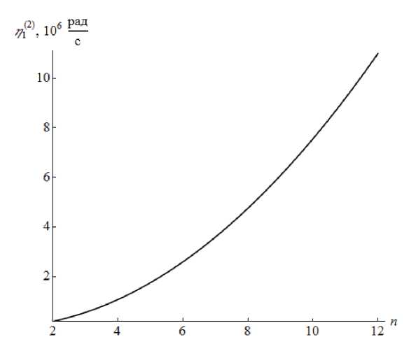 Рис. 4. Зависимость декремента затухания капиллярных осцилляций капли радиуса R = 5 мкм c зарядом Q = 2 · 10−5 СГСЭ (~ 0.03Qкр) от номера моды n.