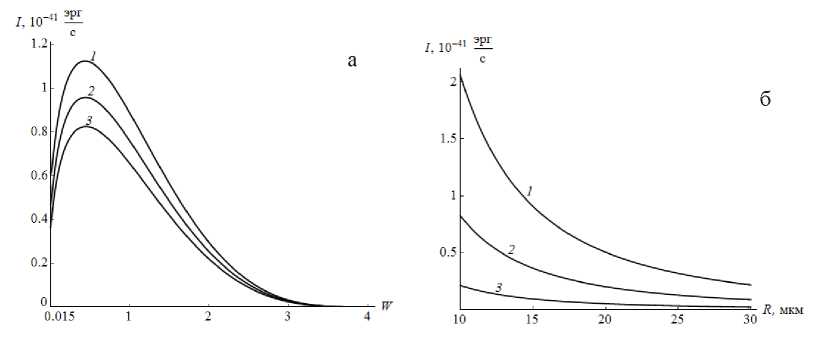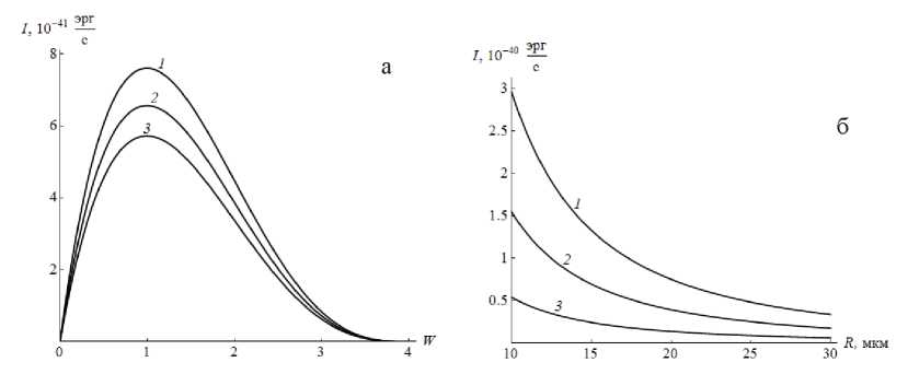 Рис. 11. Зависимость интенсивности электромагнитного излучения I заряженной вязкой капли конечной электропроводности от параметра Релея W (а) и радиуса R (б).