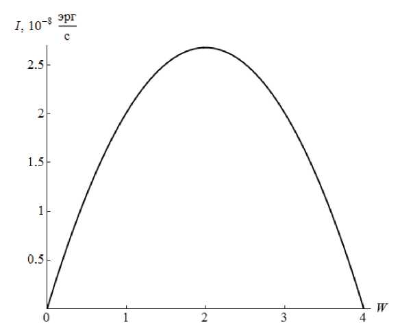 Рис. 10. Зависимость интенсивности электромагнитного излучения I заряженной капли идеальной идеально проводящей жидкости от параметра Релея W, построенная по [1].