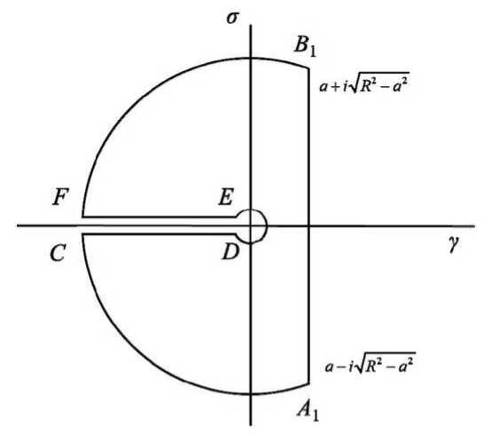 Следовательно, для интегрирования изображений рассмотрим замкнутый контур на комплексной плоскости с разрезом вдоль отрицательной действительной полуоси, показанный на рис. 2. Внутри выбранного контура и на контуре функции (3.9) являются однозначными аналитическими функциями.