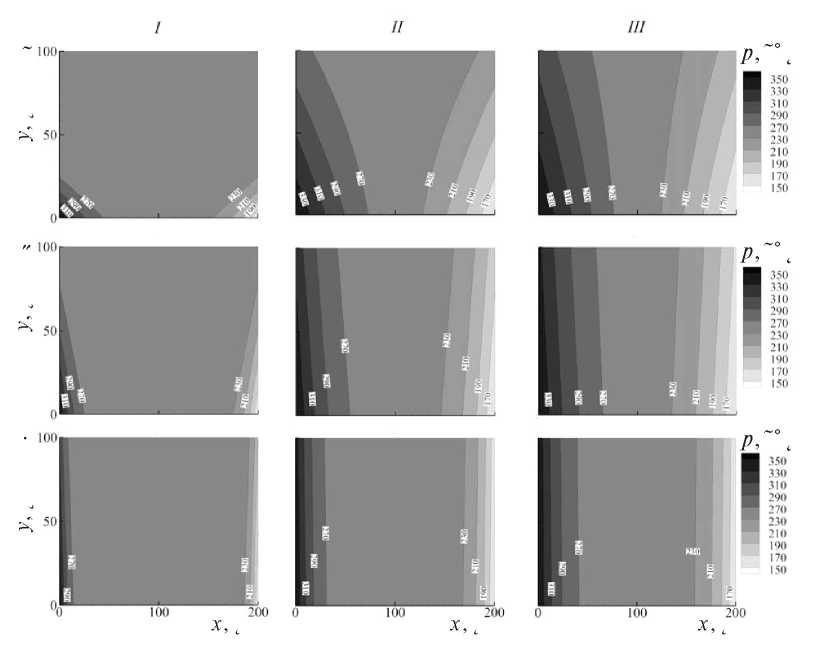 Рис. 8. Распространение давления в пласте в моменты (I–III) – t = 1, 24 и 72 ч. Ширина трещины равна w = 10–4 м: (а–в) – k = 1, 10, 100 мД