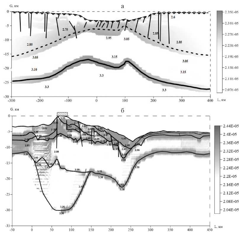 В зоне дальневосточных морей и северо-западном секторе Тихого океана массивы горных пород находятся в зоне повышенной сейсмичности и характеризуются сложностью строения за счет структурных неоднородностей. Общеизвестные критерии пластичности и прочности горных пород предполагают, что все компоненты среды достигают предельного состояния при разрушении одновременно, что, в общем случае неоднородных сред, маловероятно. Горные породы неодинаково сопротивляются растяжению, сжатию и отрыву и не могут достигать предельного состояния одновременно. Кроме этого, в расчетные формулы, как правило, входят операторы усреднения физических и механических характеристик среды, что приводит к размыванию локализации плотностных разломов и особенностей неоднородной геоструктуры. Поэтому предложенный параметр интенсивности деформаций, может быть рассмотрен как геомеханический маркер пластического деформирования, так как его распределение моделирует совпадение с заданным плотностным распределением типов вещества и разломов по всей плоскости профилей (рис. 3).